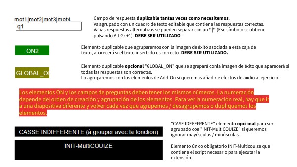 Los elementos ON y los campos de preguntas deben tener los mismos números. La numeración depende del orden de creación y agrupación de los elementos. Para ver la numeración real, hay que ir a una diapositiva diferente y volver cada vez que agrupemos / desagrupemos o dupliquemos los elementos.
