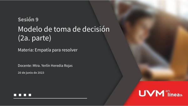 EAE Business School. (2023). Todo sobre la Teoría U. https://www.eaeprogramas.es/blog/negocio/empresa/todo-sobre-la-teoria-u Pujante, B. (s. f.) Cómo resolver y solucionar problemas. https://somosestupendas.com/como-resolver-y-solucionar-problemas/ Universidad del Valle de México. (s. f.). Empatía para resolver. Unidad 5. Modelo de toma de decisión. https://uvmonline.blackboard.com/webapps/blackboard/content/listContentEditable.jsp?content_id=_8575779_1&course_id=_145573_1&mode=reset