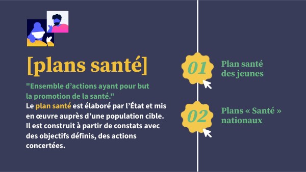 "Ensemble d’actions ayant pour but la promotion de la santé."Le plan santé est élaboré par l’État et mis en œuvre auprès d’une population cible. Il est construit à partir de constats avec des objectifs définis, des actions concertées.