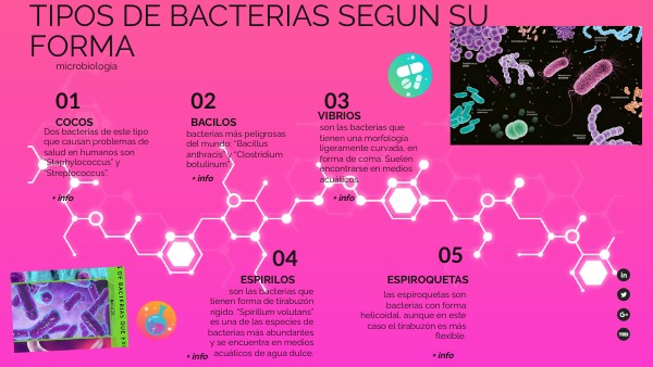 son las bacterias que tienen forma de tirabuzón rígido. “Spirillum volutans” es una de las especies de bacterias más abundantes y se encuentra en medios acuáticos de agua dulce.