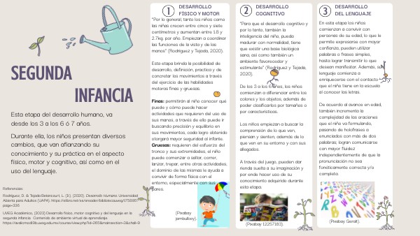 Referencias: Rodríguez, D. & Tejada Betancourt, L. (Il.). (2020). Desarrollo Humano. Universidad Abierta para Adultos (UAPA). https://elibro.net/es/ereader/bibliotecauveg/175895?page=336 UVEG Académico, (2023) Desarrollo físico, motor cognitivo y del lenguaje en la segunda infancia. Contenido de ambiente virtual de aprendizaje. https://avalicmod19b.uveg.edu.mx/course/view.php?id=265&mainsection=3&chall=9