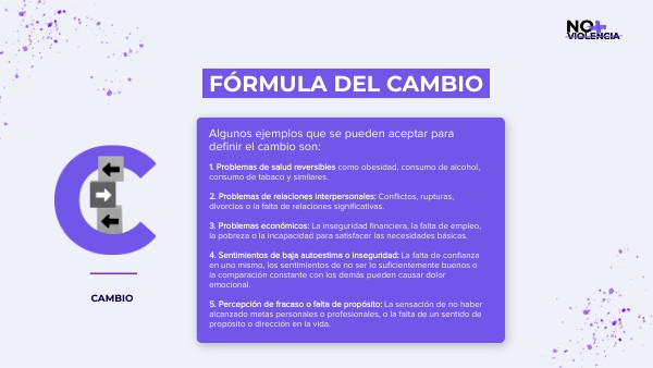 1. Problemas de salud reversibles como obesidad, consumo de alcohol, consumo de tabaco y similares. 2. Problemas de relaciones interpersonales: Conflictos, rupturas, divorcios o la falta de relaciones significativas. 3. Problemas económicos: La inseguridad financiera, la falta de empleo, la pobreza o la incapacidad para satisfacer las necesidades básicas. 4. Sentimientos de baja autoestima o inseguridad: La falta de confianza en uno mismo, los sentimientos de no ser lo suficientemente buenos o la comparación constante con los demás pueden causar dolor emocional. 5. Percepción de fracaso o falta de propósito: La sensación de no haber alcanzado metas personales o profesionales, o la falta de un sentido de propósito o dirección en la vida.