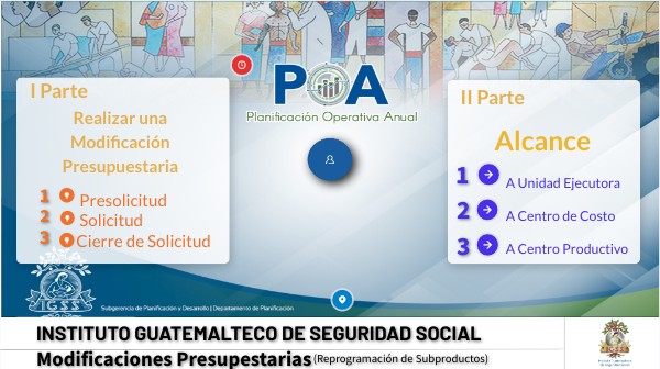 En cumplimiento de lo que establecen las normas VIII, XVI y XVII, del Acuerdo 1536 de Junta Directiva del 8 de diciembre de 2022, mediante el cual aprueba EL PRESUPUESTO GENERAL DE INGRESOS Y EGRESOS DEL INSTITUTO GUATEMALTECO DE SEGURIDAD SOCIAL, para el ejercicio 2023, el Departamento de Planificación de acuerdo al área de su competencia, presenta una actualización en el Módulo de Reprogramación de Subproductos 2.0. para agilizar el proceso y brindarles apoyo rápido y efectivo en la presentación de sus solicitudes de Moficación Presupuestaria.