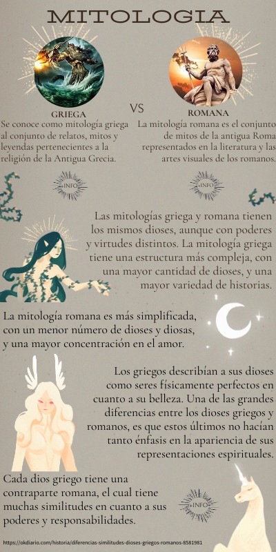 Las mitologías griega y romana tienen los mismos dioses, aunque con poderes y virtudes distintos. La mitología griega tiene una estructura más compleja, con una mayor cantidad de dioses, y una mayor variedad de historias.