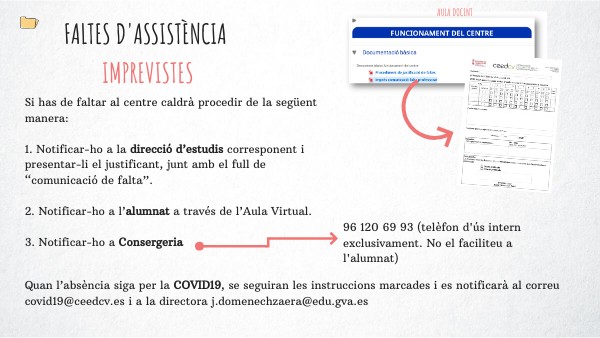 Quan l’absència siga per la COVID19, se seguiran les instruccions marcades i es notificarà al correu covid19@ceedcv.es i a la directora j.domenechzaera@edu.gva.es