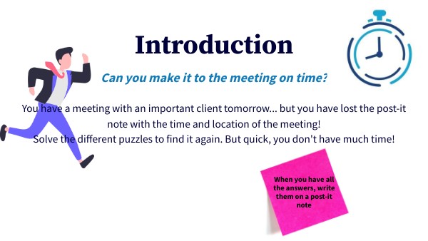 You have a meeting with an important client tomorrow... but you have lost the post-it note with the time and location of the meeting! Solve the different puzzles to find it again. But quick, you don't have much time!