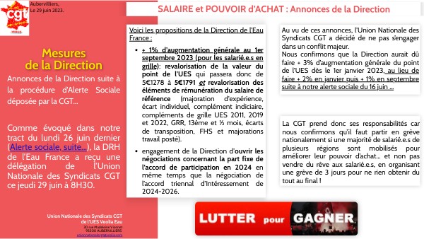 Au vu de ces annonces, l’Union Nationale des Syndicats CGT a décidé de ne pas s’engager dans un conflit majeur. Nous confirmons que la Direction aurait dû faire + 3% d’augmentation générale du point de l’UES dès le 1er janvier 2023, au lieu de faire + 2% en janvier puis + 1% en septembre suite à notre alerte sociale du 16 juin …