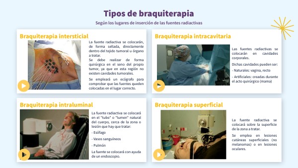 Las fuentes radiactivas se colocarán en cavidades corporales. Dichas cavidades pueden ser: - Naturales: vagina, recto - Artificiales: creadas durante el acto quirúrgico (mama)
