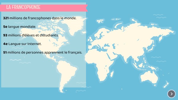 321 millions de francophones dans le monde.5e langue mondiale. 93 millions d’élèves et d’étudiants. 4e Langue sur Internet. 51 millions de personnes apprennent le français.