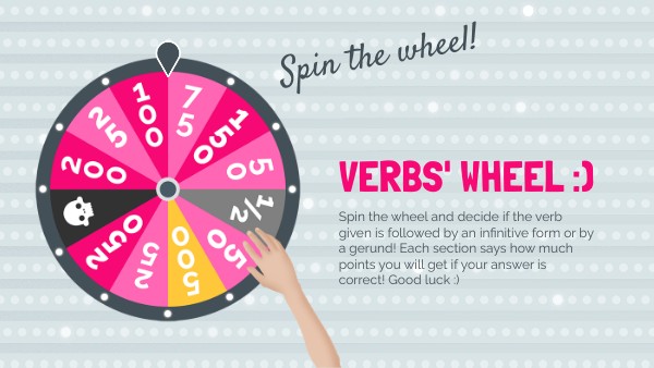 Spin the wheel and decide if the verb given is followed by an infinitive form or by a gerund! Each section says how much points you will get if your answer is correct! Good luck :)