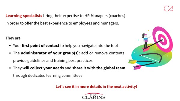 Learning specialists bring their expertise to HR Managers (coaches) in order to offer the best experience to employees and managers.They are: