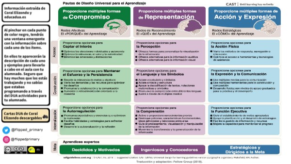 Al pinchar en cada punto de color negro, tendrás una ventana emergente con la información sobre cada uno de los ítems. En ellos te aparecerán la descripción de cada uno y ejemplos para llevarlo a cabo en el aula con tu alumnado. Seguro que hay muchos que los estás trabajando y no sabías que estabas programando a través del DUA actividades para tu alumnado.