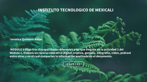 Veronica Quintero Rosas MODULO 3 Elige tres discapacidades diferentes a las que elegiste en la actividad 2 del Módulo 1, Elabora un recurso educativo digital: tríptico, genially, infografía, video, podcast entre otros y en el cual compartas la información analizada en el documento.