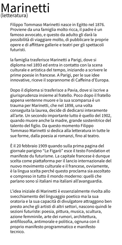 Filippo Tommaso Marinetti nasce in Egitto nel 1876. Proviene da una famiglia molto ricca, il padre è un famoso avvocato, e questo da adulto gli darà la possibilità di viaggiare molto, di pubblicare le proprie opere e di affittare gallerie e teatri per gli spettacoli futuristi. la famiglia trasferisce Marinetti a Parigi, dove si diploma nel 1893 ed entra in contatto con la scena culturale e artistica del tempo, iniziando a scrivere le prime poesie in francese. A Parigi, per le sue idee innovative, riceve il soprannome di Caffeina d’Europa. Dopo il diploma si trasferisce a Pavia, dove si iscrive a giurisprudenza insieme al fratello. Poco dopo il fratello appena ventenne muore e la sua scomparsa è un trauma per Marinetti, che nel 1898, una volta conseguita la laurea, decide di dedicarsi interamente all’arte. Un secondo importante lutto è quello del 1902, quando muore anche la madre, grande sostenitrice del talento del figlio. Da questo momento Filippo Tommaso Marinetti si dedica alla letteratura in tutte le sue forme, dalla poesia ai romanzi, fino al teatro. È il 20 febbraio 1909 quando sulla prima pagina del giornale parigino “Le Figarò” esce il testo Fondation et manifeste du futurisme. La capitale francese è dunque scelta come piattaforma per il lancio internazionale del nuovo movimento culturale e il francese, ovviamente, è la lingua scelta perché questo proclama sia ascoltato e compreso in tutto il mondo moderno: quelli che parlano sono sì italiani ma italiani all’avanguardia. L’idea iniziale di Marinetti è essenzialmente rivolta allo svecchiamento del linguaggio poetico ma la sua oratoria e la sua capacità di divulgatore attraggono ben presto anche gli artisti di altri settori, nascono quindi le sezioni futuriste: poesia, pittura, musica, scultura, azione femminile, arte dei rumori, architettura, antifilosofia, antimorale e politica, ognuna con il proprio manifesto programmatico e manifesto tecnico. Questi testi propagandistici e divulgativi, scritti da Marinetti e firmati dagli aderenti, sono il suo migliore prodotto letterario. E il primo “Il Manifesto” per antonomasia è il modello di tutti i successivi, analizziamone dunque i passaggi fondamentale per rintracciare i principi che animano tutto il movimento culturale fino al primo dopoguerra. Un linguaggio potente, traboccante, carico d’entusiasmo, ma cosa dovrebbe fare un giovane poeta dopo averlo letto? Dimenticarsi del passato ok, ripudiare gli studi classici va bene, schifare le biblioteche e i musei che sono pieni di “roba morta” benissimo… ma questa potenza creatrice dove la riversa? Che deve fare con la sua penna? Be’ in effetti questo Marinetti ancora non lo spiega… Per fortuna gli vengono in soccorso gli amici pittori, e non è un caso se immediatamente dopo viene diffuso attraverso un volantino il Manifesto tecnico della pittura futurista, firmato da Boccioni, Carrà, Russolo, Balla e Severini, cui seguono le prime mostre futuriste a Roma e naturalmente a Parigi. I pittori, appunto, che hanno una esigenza materiale, che devono tradurre le parole in pratica mettono appunto il concetto di dinamismo attraverso la figura che perde i margini e che, con una tecnica prettamente divisionista, si deve fondere con il contesto circostante, spiegano la loro tavolozza fatta di colori puri e di accostamenti complementari e i nuovi soggetti che sono il treno, la macchina, la città brulicante di vita… solo nel 1913 anche i poeti avranno finalmente anche loro qualche indicazione “pratica” come le parole in libertà, l’aggettivazione semaforica, l’uso del verbo all’infinito, l’abolizione delle regole ortografiche e sintattiche, l’uso del verso libero e dei segni matematici, la rivoluzione tipografica in cui l’organizzazione del testo sulla pagina bianca assume nella sua disposizione un valore figurativo.