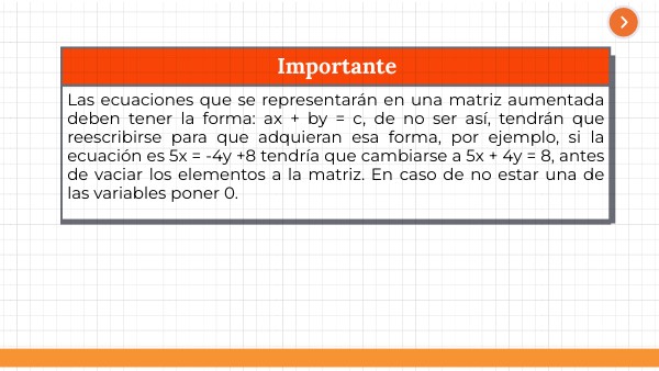 Las ecuaciones que se representarán en una matriz aumentada deben tener la forma: ax + by = c, de no ser así, tendrán que reescribirse para que adquieran esa forma, por ejemplo, si la ecuación es 5x = -4y +8 tendría que cambiarse a 5x + 4y = 8, antes de vaciar los elementos a la matriz. En caso de no estar una de las variables poner 0.