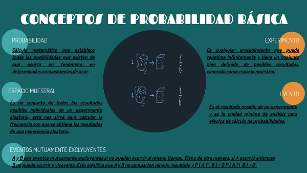 infografía 1 en donde definas los conceptos de probabilidad básica: - Probabilidad - Experimento - Espacio muestral - Evento - Eventos mutuamente excluyentes