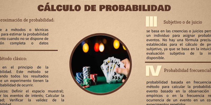 Infografia 2, define y explica los métodos para el cálculo de probabilidad: - Aproximación de probabilidad - Método clásico - Subjetivo o de juicio - Probabilidad frecuencial.