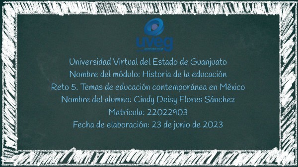 Universidad Virtual del Estado de GuanjuatoNombre del módulo: Historia de la educación Reto 5. Temas de educación contemporánea en México Nombre del alumno: Cindy Deisy Flores Sánchez Matrícula: 22022903 Fecha de elaboración: 23 de junio de 2023