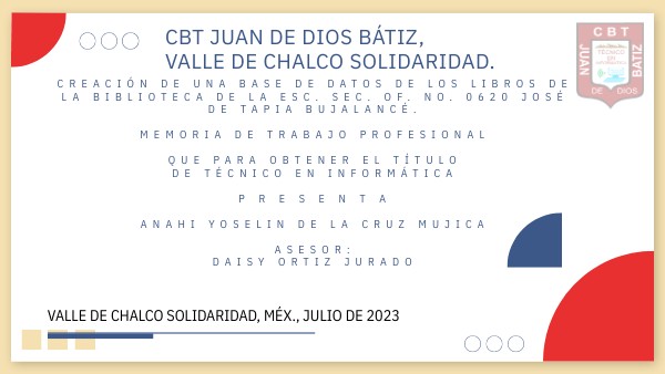 CREACIÓN DE UNA BASE DE DATOS DE LOS LIBROS DE LA BIBLIOTECA DE LA ESC. SEC. OF. NO. 0620 JOSÉ DE TAPIA BUJALANCÉ. MEMORIA DE TRABAJO PROFESIONAL QUE PARA OBTENER EL TÍTULO DE TÉCNICO EN INFORMÁTICA P R E S E N T A ANAHI YOSELIN DE LA CRUZ MUJICA ASESOR: DAISY ORTIZ JURADO