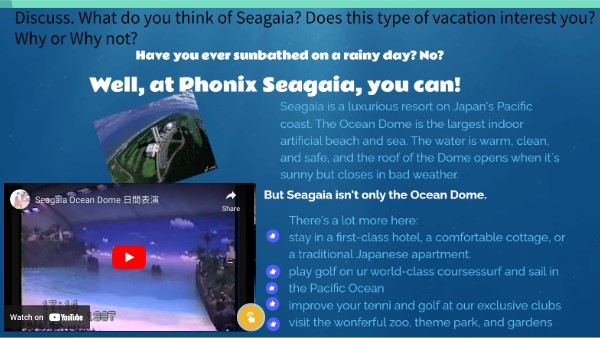 2.- Read the brochure below. What can you do at Seagaia? -................... 3.- Match the adjetives to their meanings.