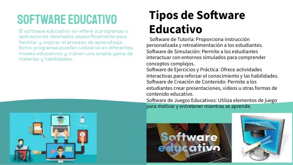 Software de Tutoría: Proporciona instrucción personalizada y retroalimentación a los estudiantes. Software de Simulación: Permite a los estudiantes interactuar con entornos simulados para comprender conceptos complejos. Software de Ejercicios y Práctica: Ofrece actividades interactivas para reforzar el conocimiento y las habilidades. Software de Creación de Contenido: Permite a los estudiantes crear presentaciones, videos u otras formas de contenido educativo. Software de Juegos Educativos: Utiliza elementos de juego para motivar y entretener mientras se aprende.