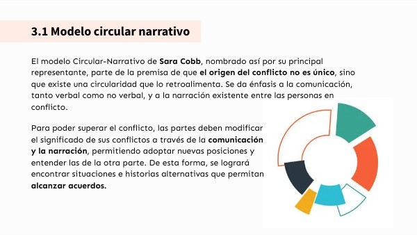 El modelo Circular-Narrativo de Sara Cobb, nombrado así por su principal representante, parte de la premisa de que el origen del conflicto no es único, sino que existe una circularidad que lo retroalimenta. Se da énfasis a la comunicación, tanto verbal como no verbal, y a la narración existente entre las personas en conflicto.