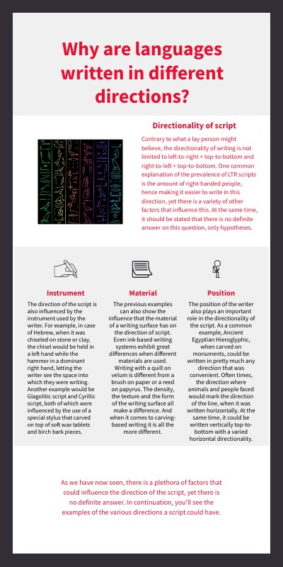 The position of the writer also plays an important role in the directionality of the script. As a common example, Ancient Egyptian Hieroglyphic, when carved on monuments, could be written in pretty much any direction that was convenient. Often times, the direction where animals and people faced would mark the direction of the line, when it was written horizontally. At the same time, it could be written vertically top-to-bottom with a varied horizontal directionality.