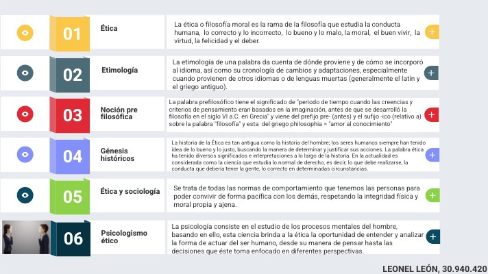 La ética o filosofía moral es la rama de la filosofía que estudia la conducta humana, lo correcto y lo incorrecto, lo bueno y lo malo, la moral, el buen vivir, la virtud, la felicidad y el deber.