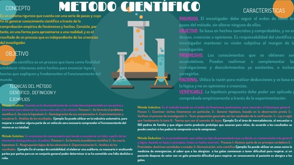 Método Analítico. Consiste en la desmembración de un todo descomponiendolo en sus partes o elementos para observar las causas naturales y los efectos. Proceso 1.- Se formula el problema cientifico 2.-Se crea la hipootesis 3.- Desintegración de sus componentes 4.-Experimentación y muestreo 5.- Análisis de los resultados. Ejemplo Se puede utilizar en la industria automotriz, para mejorar o cambiar alguna parte de un vehiculo sera necesario comprender el funcionamiento del mismo en su totaliad. Método Sintético Es un proceso de razonamiento que tiende a reconstruir un todo, a partir de los elementos distinguidos por el análisis. Proceso 1.- Se formula el problema cientifico 2.-Se crea la hipootesis 3.- Reagrupación lógica de los elementos 4.-Experimentación 5.- Análisis de los resultados. Ejemplio En el campo de contabilidad, al elaborar una auditoria, es necesario ir analizando partes por partes para en un conjunto general poder determinar si se ha cometido una falta desfalco o robo.