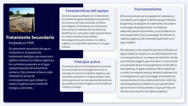 El funcionamiento de los equipos de tratamiento secundario varía según el tipo de equipo utilizado. En general, los equipos de tratamiento secundario se encargan de proporcionar un ambiente adecuado para el crecimiento y la actividad de los microorganismos, que se encargan de remover la materia orgánica y los nutrientes presentes en el agua residual.Por ejemplo, en los reactores de lodos activados, el agua residual se mezcla con una biomasa activa de microorganismos en un tanque de aireación, donde se suministra oxígeno para mantener el crecimiento y la actividad de los microorganismos. En los filtros percoladores, el agua residual se filtra a través de un lecho de material poroso, donde se adhieren los microorganismos que se encargan de remover los contaminantes. En los sistemas de lecho móvil, los microorganismos se adhieren a un soporte móvil que se mueve continuamente, lo que permite una alta tasa de remoción de materia orgánica.