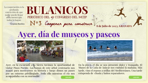 Cincuenta Congreso, ¿en dónde será? Allí donde sea la gallina irá. Gente freinetiana: empuje, emoción. Montando congresos sois de lo mejor. Tropa mecepera con mágica chispa. ¡Ojo a sus movidas, les sigo la pista! A Pitiña dos Prados / La Gallina Mecepera Graná, 07/07/23 Mecepera Graná, 07/07/23