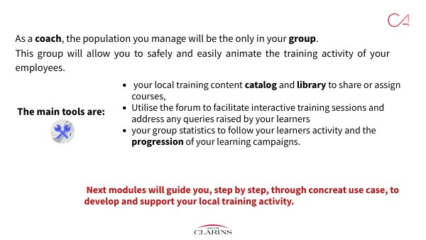 As a coach, the population you manage will be the only in your group.This group will allow you to safely and easily animate the training activity of your employees. The main tools are: