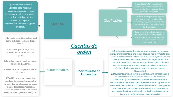 1. No afectan o modifican el activo, el pasivo o el capital contable de una entidad. 2. Se utilizan para el registro de movimientos de bienes y valores ajenos. 3. Se utilizan para el registro y control de emisión de valores . 4. Se clasifican para su presentación en el balance. 5. También se les conoce con otros nombres: también se les denomina cuentas de movimiento compensado, cuentas de saldos compensados, cuentas de saldos correlativos, cuentas de memorándum y cuentas de registro.