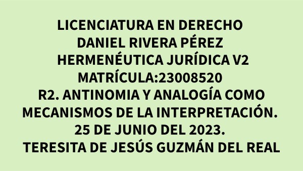 LICENCIATURA EN DERECHO DANIEL RIVERA PÉREZ HERMENÉUTICA JURÍDICA V2 MATRÍCULA:23008520 R2. ANTINOMIA Y ANALOGÍA COMO MECANISMOS DE LA INTERPRETACIÓN. 25 DE JUNIO DEL 2023. TERESITA DE JESÚS GUZMÁN DEL REAL
