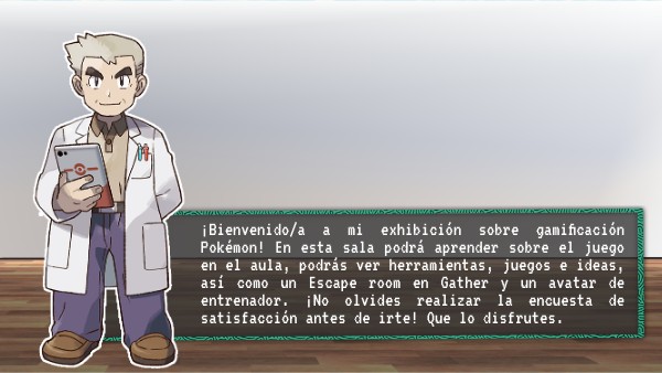 ¡Bienvenido/a a mi exhibición sobre gamificación Pokémon! En esta sala podrá aprender sobre el juego en el aula, podrás ver herramientas, juegos e ideas, así como un Escape room en Gather y un avatar de entrenador. ¡No olvides realizar la encuesta de satisfacción antes de irte! Que lo disfrutes.
