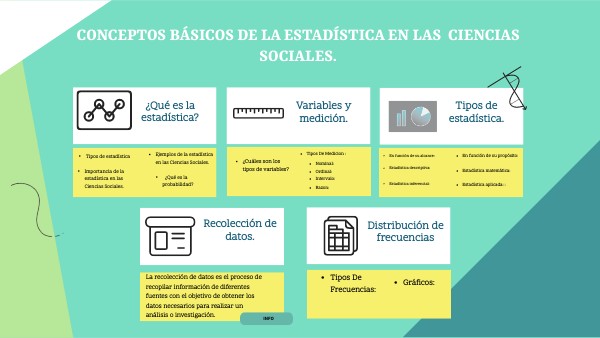 - Estadística descriptiva: se encarga de organizar y resumir datos para obtener una mejor comprensión de ellos, utilizando medidas de tendencia central (media, mediana, moda) y de dispersión (desviaciónándar, rango intercuartílico).