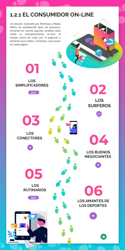 Un estudio realizado por McKinsey y Media Metrix ha establecid6 tipos de personas, tomando en cuenta algunas variables para medir su comportamiento on-line: el tiempo activo de cada uno, la págunas y dominios que visitan y el tiempo que pasan en cada página