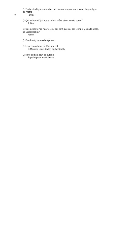 Q: Toutes les lignes de métro ont une correspondance avec chaque ligne de métroR: Vrai Q: Qui a chanté "j'ai voulu voir ta mère et on a vu ta soeur"R: BrelQ: Qui a chanté "Je m'arreterai pas tant que j'ai pas le milli / so à la secte, so Gisèle Halimi"R: moiQ: Elephant / tonne d'éléphantQ: Le prénom/nom de Maxime est R: Maxime Louis Jaden Corbe SmithQ: Note au bac, tout de suite !!R: point pour le débilosse