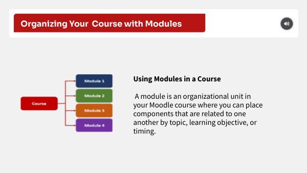 Using Modules in a Course A module is an organizational unit in your Moodle course where you can place components that are related to one another by topic, learning objective, or timing.
