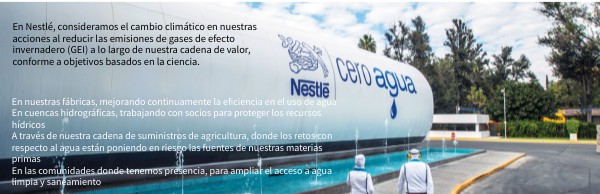 En Nestlé, nos preocupamos por el agua y centramos nuestros esfuerzos y recursos en cuatro áreas clave en las que esto es primordial: En nuestras fábricas, mejorando continuamente la eficiencia en el uso de agua En cuencas hidrográficas, trabajando con socios para proteger los recursos hídricos A través de nuestra cadena de suministros de agricultura, donde los retos con respecto al agua están poniendo en riesgo las fuentes de nuestras materias primas En las comunidades donde tenemos presencia, para ampliar el acceso a agua limpia y saneamiento