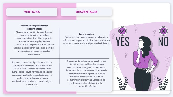 Variedad de experiencias y conocimientos:Al suponer la reunión de miembros de diferentes disciplinas, el trabajo colaborativo interdisciplinario permite aprovechar una amplia gama de conocimientos y experiencia. Esto permite abordar las problemáticas desde múltiples perspectivas y ofrecer respuestas innovadoras.