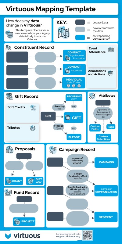 This template offers a visual overview on how your legacy data is likely to map in Virtuous.