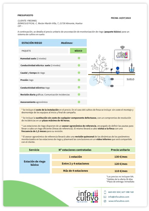* Se incluye el coste de la instalación en el precio. En el caso del cultivo de fresa se incluye sin coste el montaje y desmontaje de los equipos al inicio y final de campaña. * Se incluye la sustitución sin coste de cualquier componente defectuoso, con un compromiso de resolución de incidencias en un plazo máximo de 48 horas. * Las estaciones de riego disponen de un asesor agronómico de referencia, encargado de definir las pautas para llevar a cabo un riego eficiente (líneas de referencia). El mismo llevará a cabo visitas a la finca con una frecuencia de 1,5 meses para su revisión. * El asesor agronómico de referencia llevará cabo una revisión quincenal de las dinámicas de los parámetros monitorizados en las estaciones de riego y plasmará las conclusiones en un video informe que será compartido con el cliente.