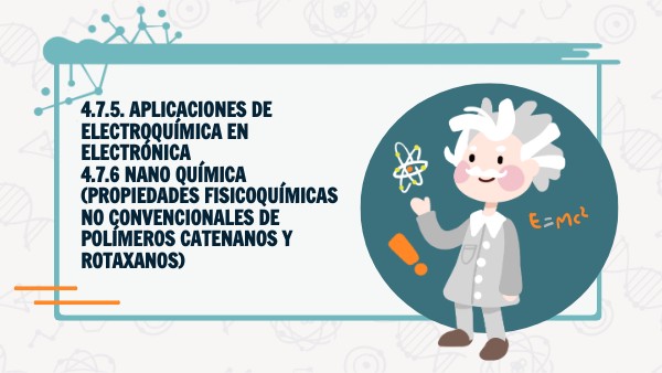 4.7.5. Aplicaciones de electroquímica en electrónica 4.7.6 nano química (propiedades fisicoquímicas no Convencionales de polímeros Catenanos y Rotaxanos)