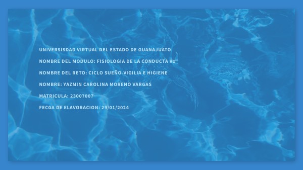 UNIVERSISDAD VIRTUAL DEL ESTADO DE GUANAJUATO NOMBRE DEL MODULO: FISIOLOGIA DE LA CONDUCTA V1 NOMBRE DEL RETO: CICLO SUEÑO-VIGILIA E HIGIENE NOMBRE: YAZMIN CAROLINA MORENO VARGAS MATRICULA: 23007007 FECGA DE ELAVORACION: 29/01/2024