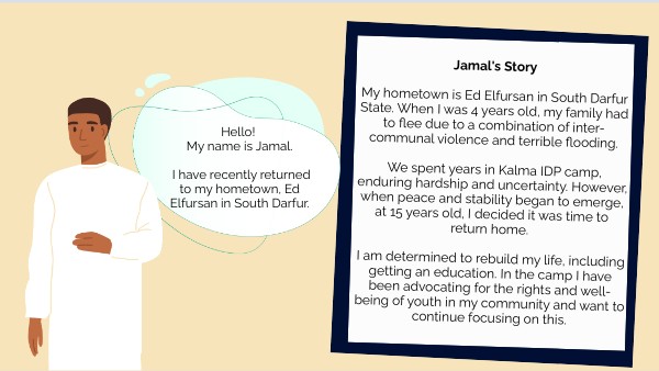 Jamal's Story My hometown is Ed Elfursan in South Darfur State. When I was 4 years old, my family had to flee due to a combination of inter-communal violence and terrible flooding. We spent years in Kalma IDP camp, enduring hardship and uncertainty. However, when peace and stability began to emerge, at 15 years old, I decided it was time to return home. I am determined to rebuild my life, including getting an education. In the camp I have been advocating for the rights and well-being of youth in my community and want to continue focusing on this.