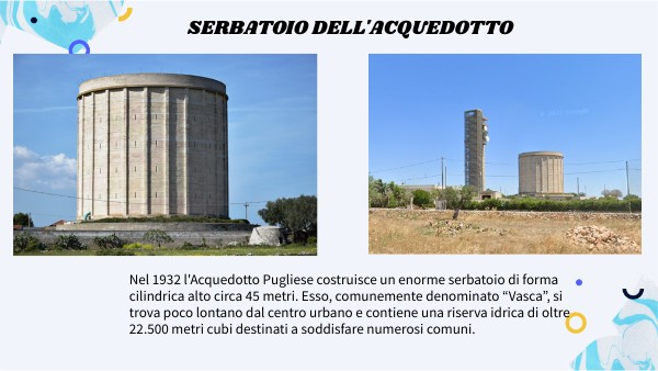 Nel 1932 l'Acquedotto Pugliese costruisce un enorme serbatoio di forma cilindrica alto circa 45 metri. Esso, comunemente denominato “Vasca”, si trova poco lontano dal centro urbano e contiene una riserva idrica di oltre 22.500 metri cubi destinati a soddisfare numerosi comuni.