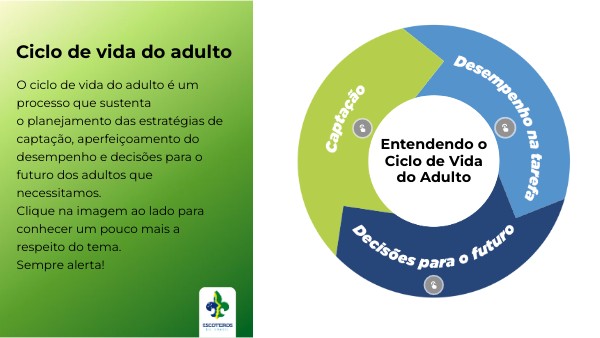 O ciclo de vida do adulto é um processo que sustenta o planejamento das estratégias de captação, aperfeiçoamento do desempenho e decisões para o futuro dos adultos que necessitamos. Clique na imagem ao lado para conhecer um pouco mais a respeito do tema. Sempre alerta!