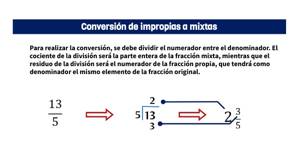 Para realizar la conversión, se debe dividir el numerador entre el denominador. El cociente de la división será la parte entera de la fracción mixta, mientras que el residuo de la división será el numerador de la fracción propia, que tendrá como denominador el mismo elemento de la fracción original.