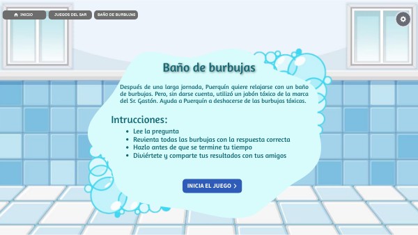 Después de una larga jornada, Puerquín quiere relajarse con un baño de burbujas. Pero, sin darse cuenta, utilizó un jabón tóxico de la marca del Sr. Gastón. Ayuda a Puerquín a deshacerse de las burbujas tóxicas.